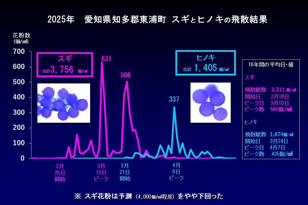 2025年のスギ花粉 飛散総数は 3,756個で、例年を400個ほど上回りました。2024年夏が花粉生育に良い条件でしたので4,000程度と予測しており、概ね合致しました。飛散開始は2月25日、ピークは3月13日の631個でした。ヒノキ花粉