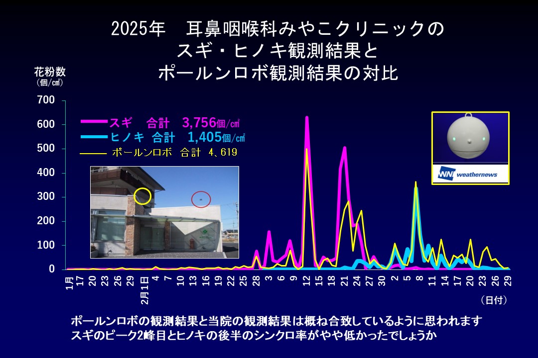 ウエザーニュース社のポールンロボとの対比です。概ね合致しているように思われますが、スギのピーク2峰目と、ヒノキの後半のシンクロ率がやや低かったように見受けます。