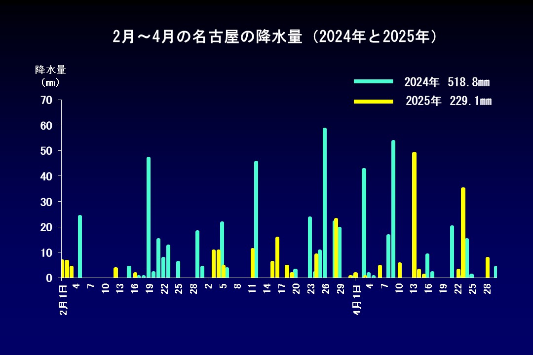 2月から4月までの名古屋の降水量を、2024年と2025年で比較しております。昨年24年は多く、今年は少なく、2.3倍の開きがありました。