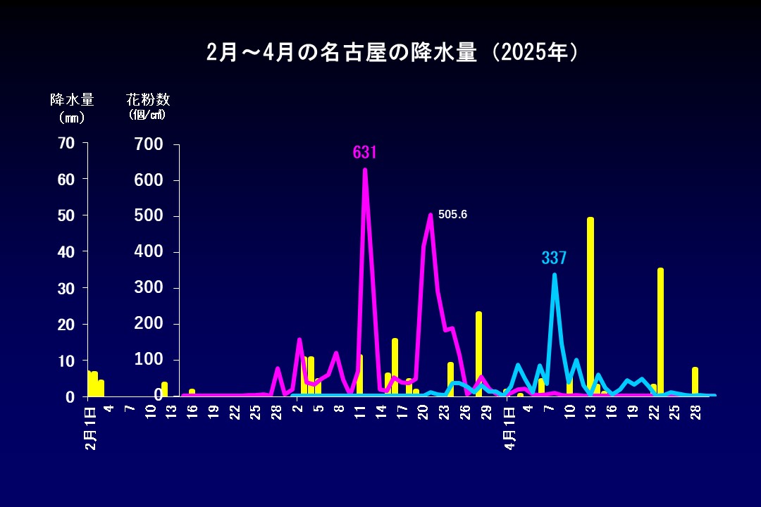 同様に、今年の降水量グラフに、花粉飛散を重ねてみます。3月までの降水量が少なく、予測に近いスギ花粉が飛散したと考えられます。4月中旬にまとまった雨が降り、ヒノキが伸び悩みました。