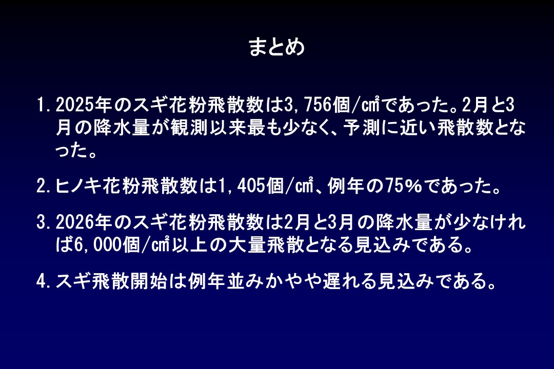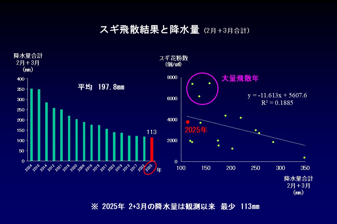 左のグラフは2月と3月の降水量のグラフです。多い年の順に並べています。2024年は歴代最多、25年は最少で、この2年は対照的でした。右のグラフは縦軸にスギ花粉飛散数、横軸に降水量をとり、観測年をプロットしました。相関はありませんが、大量飛散年は降水量が少ない傾向にあります。