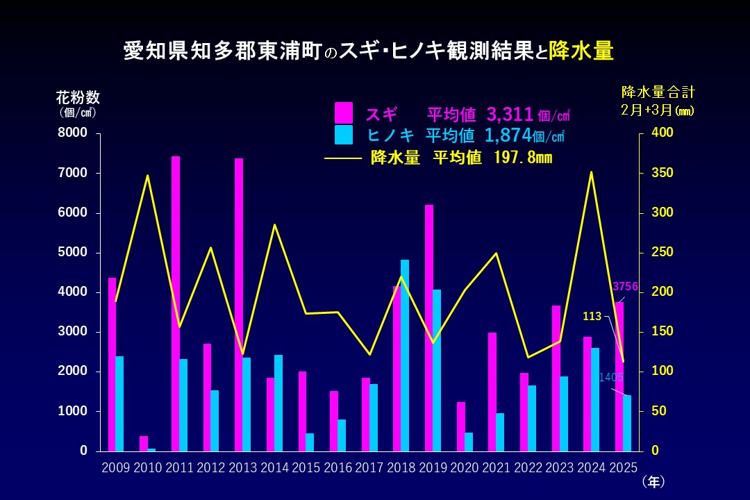 2009年からの飛散結果と降水量です。花粉が多い年は降水量が少なく、花粉が少ない年は降水量は多いような傾向を認めます。今年の降水量は少なく、スギ花粉は例年以上の飛散となりました。