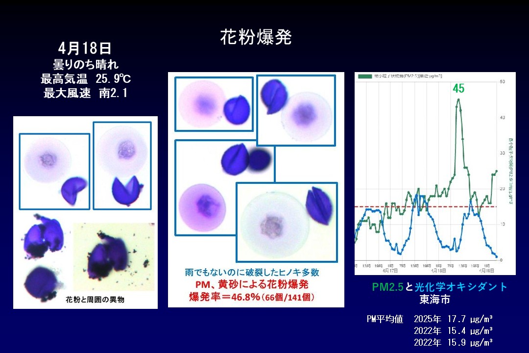 ヒノキ花粉のピークを10日過ぎた4月18日に46.8%の花粉爆発を認めました。花粉破裂が正しいかもしれません。雨が降っていないにもかかわらず半数に近い花粉の破壊が認められPM2.5による影響が考えられました。
