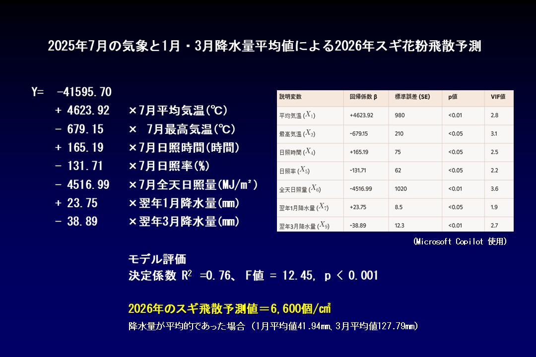 2025年7月の気象と1月・3月降水量の平均値を用いて、2026年のスギ花粉飛散数予測を行ないました。生成AIのMicrosoft Copilot に過去18年間の気象データを入力したところ、7月の5項目、1月および3月の降水量と花粉飛散数との相関が高く、この様な計算式ができました。モデル評価も概ね良好と示されてはおります。この計算式から2026年のスギの予測値は6,600個で、前スライドで示した過去の経験値と概ね合致しました。2月の降水量が重要としながらも、この式に含まれなかったこと、7月の気象項目と内容を吟味していくことなど、今後の検証が不可欠です。