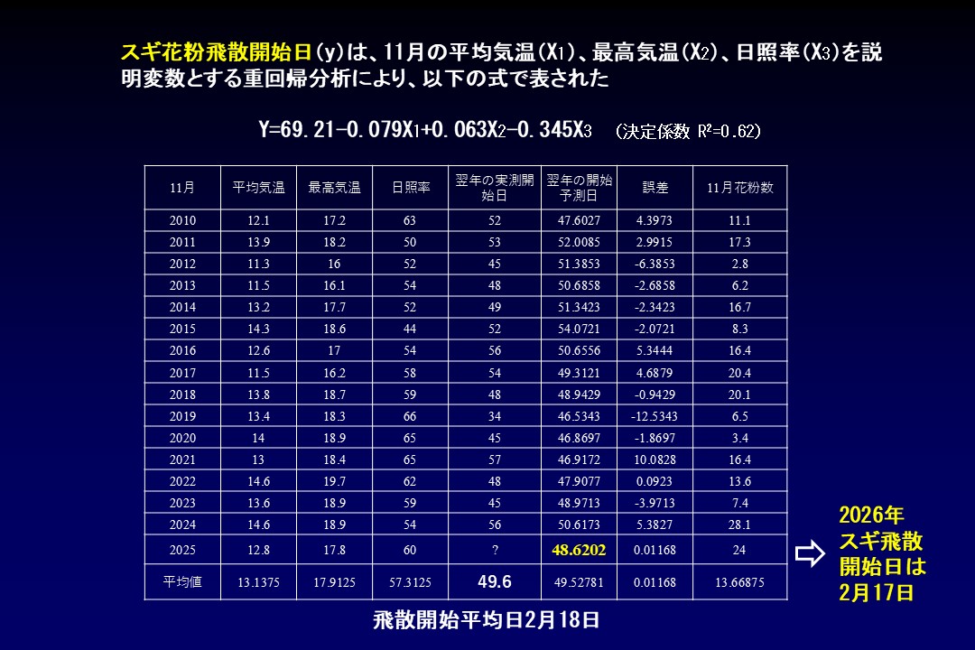 11月の平均気温、最高気温、日照率と、スギ花粉飛散開始日をAIに入力し、重回帰分析を行なったところ、2026年のスギ飛散開始は、平均日より1日早い、2月17日となりました。