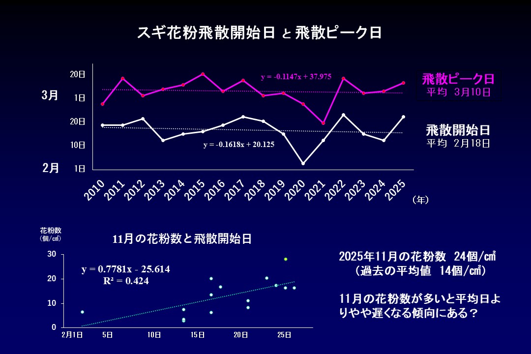 スギ花粉飛散開始日・飛散ピーク日とも少しずつ早まる傾向にありますので、AIが算出した2月17日は、平均日より1日早く、リーズナブルな印象を受けますが、一方で、相関は無いものの、11月の花粉が多いと開始日は遅くなる傾向を認めております。今年の11月のスギ花粉は24個で平均より10個多かったため、平均日の2月18日より遅れる可能性が考えられます。