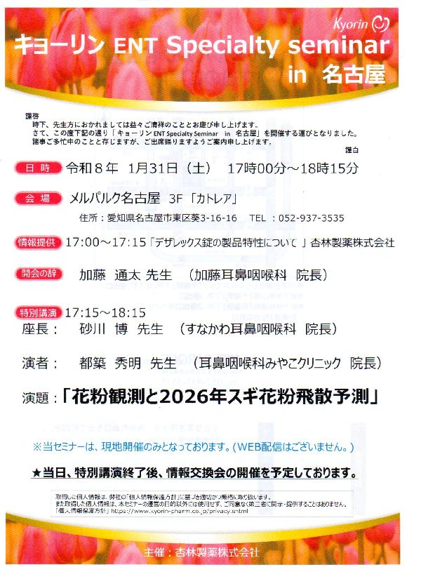 キョーリン ENT Speciality seminar in 名古屋 にて「花粉観測と2026年スギ花粉飛散予測」を発表いたしました